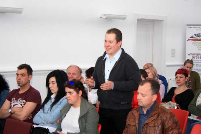The councillor talked about one of the biggest problems faced by Romanian workers: renting and living in overcrowded accommodation where very often rooms are being sublet. He described the legislation regulating rentals and the multiple occupancy license requirements. Knowing that most Romanians rent houses from private landlords, often at very high prices, the councillor knows that often people share accommodation. Mr. Kendler explained the dangerous risks to which people expose themselves if they live in houses which are overcrowded and are not fit for multiple occupancy and asked people to come forward and report such landlords as letting houses which are not fit for purpose and which do not meet the multiple occupancy licencing requirements is a criminal offence." Romanians are hard workers and they do not have time to raise issues " said the councillor who believes it is utterly important for Romanians to discuss with the council, to find out information about the services which they as residents have access to. The councillor offered the participants his contact details and explained the ways in which he can be contacted.